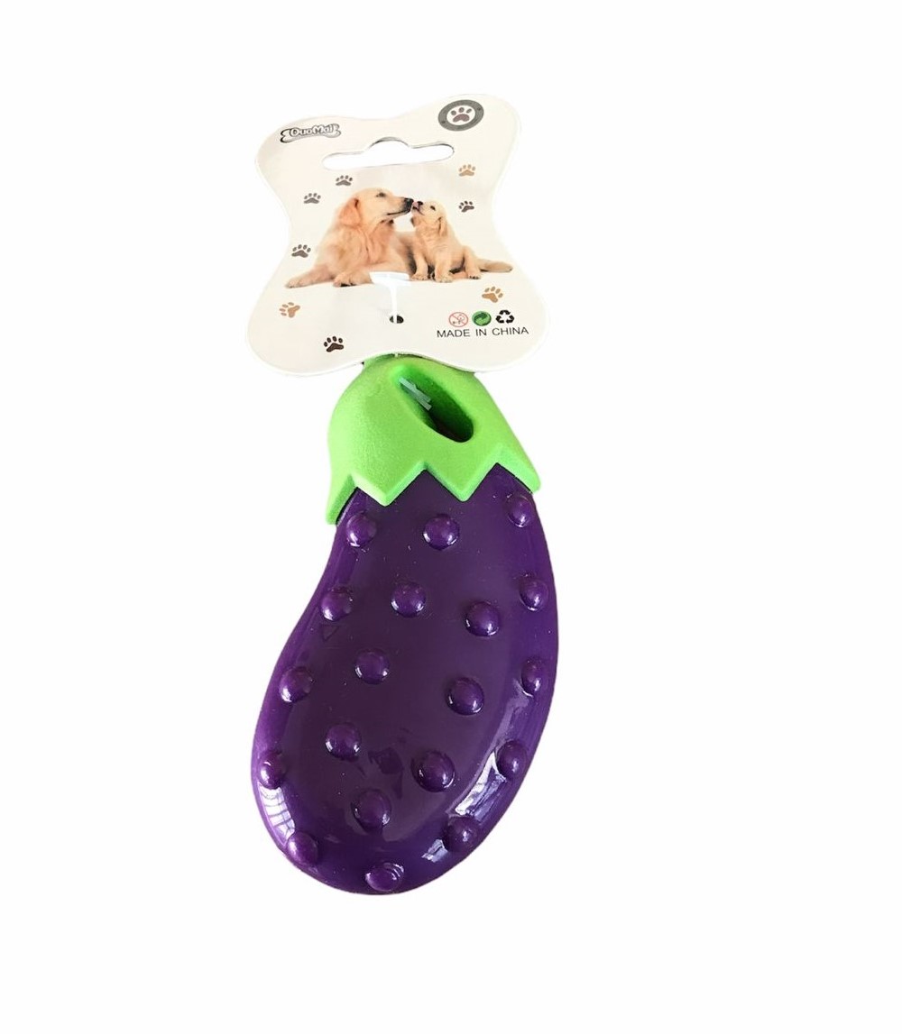 Juguete para perros en forma de berenjena, con sonido cuando se presiona es ideal para ser lanzada y que el perro vaya a buscarla y nos lo traiga. También para que se entretenga masticándola. Tiene relieve y textura para masajear las encías y ayudar a la higiene dental, favoreciendo la eliminación del sarro y previniendo la formación de la placa.