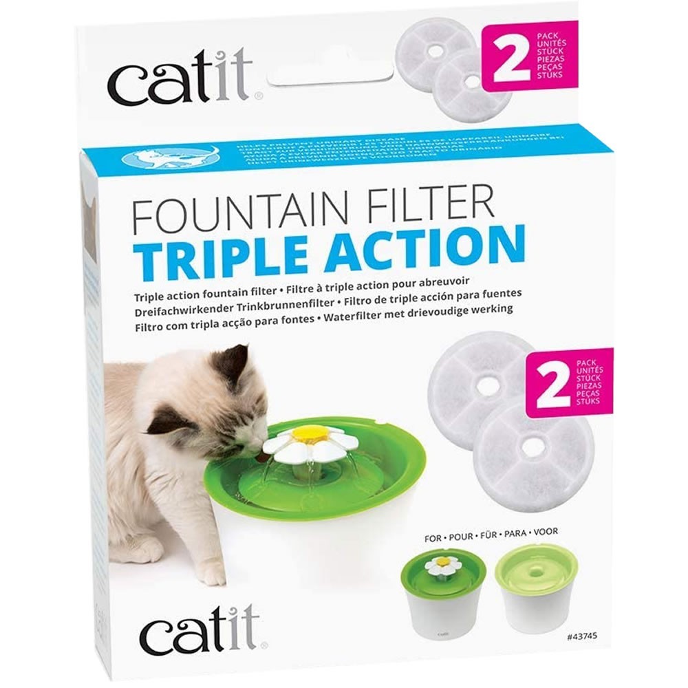 Catit Filtros Triple Acción es un pack de dos filtros de repuesto compatibles con las fuente bebederas Catit. Este filtro elimina los olores causados por las bacterias, además la resina de intercambio iónico ablanda el agua potable, eliminando el magnesio y el calcio del agua potable. Estos minerales pueden acumularse en el tracto urinario inferior de tu mascota y producir enfermedades del tracto urinario, que es un problema de salud común en los Gatos. Finalmente, la malla filtra los pelos, sedimentos y residuos que hay en el agua.