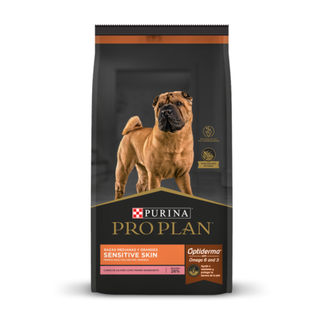 PRO PLAN Adult Sensitive Skin es una dieta de alta tolerancia que no contiene alérgenos comunes. Formulado con proteínas limitadas y seleccionadas como el salmón, para minimizar el riesgo de irritación de la piel asociada con la sensibilidad alimentaria común.